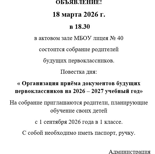 Родительское собрание « Организация приёма документов будущих первоклассников на 2026 – 2027 учебный год» состоится 18 марта в 18.30